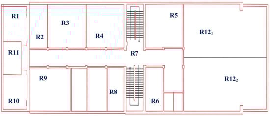 For data transmission, the floor of a university building was chosen to conduct the experiment in different rooms for several days. Figure 5 shows the floor plan and dimensions. For every room, a code was given (for example R1), and a channel was created on the Thingspeak platform. Multiple IoT boxes were assembled so that every room had a box to effectively monitor the IAQ, and all sensors were put at a reasonable height (as close to the middle as possible) and not close to walls and windows. The microcontrollers were programmed to send a reading every 10 min. Each reading contained measurements for temperature, humidity, air pressure, CO2, CO, and PM. All boxes sent their data via Wi-Fi and the Thingspeak channels were tested to receive the readings. The measurements were collected from all rooms and uploaded to the Thingspeak platform during July and August 2019. Figure 6 shows the monitoring of the collected readings on Thingspeak for the case study.