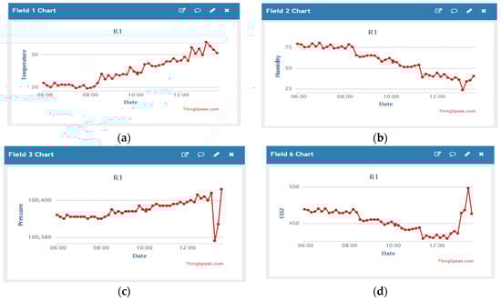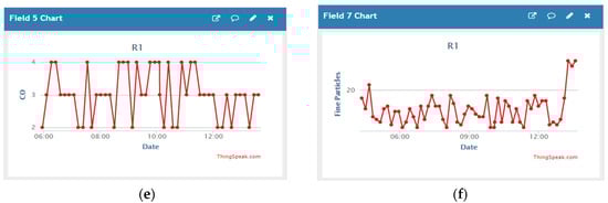 Collected readings on Thingspeak for the considered case study. (a) Temperature field test, (b) humidity field test, (c) pressure field test, (d) CO2 field test, (e) CO field test, (f) fine particles field test.