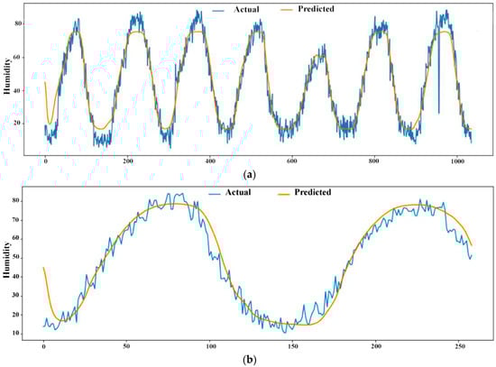 After conducting trials with multiple proportions, the percentages of the data used for training and testing were 80% and 20%, respectively. A validation set was used to independently check the performance of the ANN weights obtained in the training process. This was conducted to ensure that the ANN model had not simply overfitted or memorized the relationship between the training data and the output, but actually developed the capability to make a prediction for an unseen set of data. Figure 7 depicts the predicted (orange line) results against actual (blue line) humidity data of room R7 for the training and testing data, respectively.