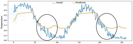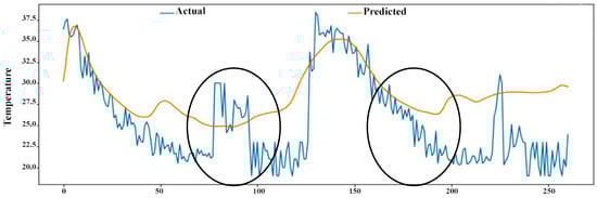 Another observation was made with respect to the loss of readings, which is attributed to wireless interruptions. Thus, such losses are represented by the discontinuity of the data and disruption over time, which affected the prediction accuracy (see Figure 9). It is worth noting that the accuracy of the model differed based on the rooms’ readings and provided, in several rooms, more than 90% accuracy for the predicted data. The high accuracy is regarded as being connected to the case study conditions (low volatile environment during summer), indicating the need to collect more readings during other seasons.
