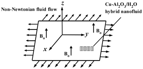 Consider the 3D incompressible viscoelastic fluid flow with HNF due to porous stretching/shrinking sheet induced by uniform magnetic field of strength , which is applied perpendicular to the fluid flow (Figure 1). The sheet is stretched/shrunk along the x-axis and the y-axis is perpendicular to it. The mass transfer is considered with chemical reaction rate . The governing equations for the defined flow are as follows (Turkyilmazoglu [21]).