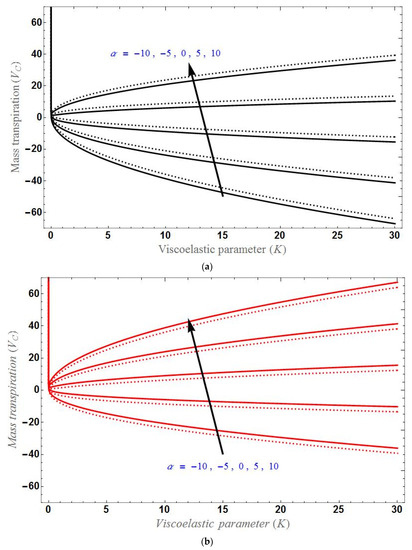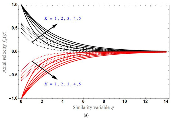Figure 2 and Figure 3 depict the behavior of with different parameters. Figure 2a,b demonstrates the solution curve of verses for stretching and shrinking sheet, respectively. The behavior of for stretching and shrinking sheet are almost same, but solution in the shrinking case will shift upward. As the parameter increases, also increases in both the cases. It is clear that, for , will decrease as K increases and for , will increase as K increases. Furthermore, for , will decrease as K increases in the stretching case and will increase as K increases in the shrinking case. Figure 3a,b show the solution domain of verses and , respectively. As increases the mass transpiration also increases. Furthermore, increases as Casson fluid parameter increases and decreases as increases. will be greater for higher values of the slip factor.