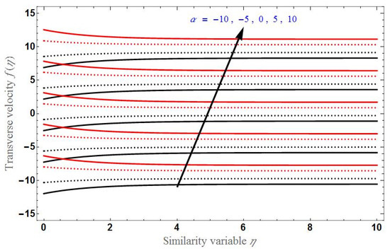 The transverse velocity for different values of . Black curves denote stretching case and red curves denote shrinking case .