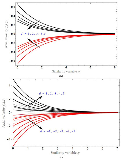 Figure 4 depicts the transverse velocity for different values of for both stretching and shrinking cases and increases with increases in . Transverse velocity increases with increases in slip factor in the stretching case and decreases with increases in the slip factor in the shrinking case. Figure 5 demonstrates the axial velocity for various , and d in both stretching and shrinking cases. Axial velocity increases with increases in or d for the stretching case and decreases with increases in or d for the shrinking case. In reverse, the axial velocity is lower for higher values of in the stretching case and is higher for higher values of in the shrinking case. Axial velocity decreases up to certain values of , then becomes constant in the stretching case and continues increasing up to certain values of , then becomes constant in the shrinking case.
