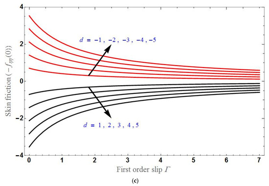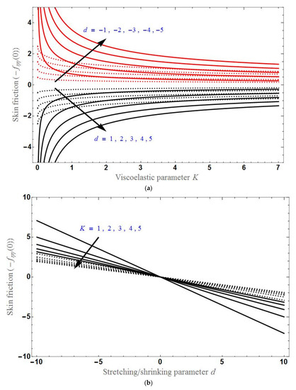The behavior of skin friction with different parameters is analyzed in Figure 6. The effect of various values of d on skin friction versus K and versus is demonstrated in Figure 6a,b, respectively, showing that skin friction is less for higher values of d. Furthermore, the skin friction is higher in the shrinking sheet case than in the stretching sheet case. Skin friction is increases with increases in K or and becomes constant after a certain stage in the stretching case and will decrease with increases in K or for the shrinking sheet case. It can also be observed in Figure 6c, which demonstrates the skin friction verses d for different values of K, where the stretching and shrinking cases are observed in the domains and , respectively. Skin friction decreases as d increases.