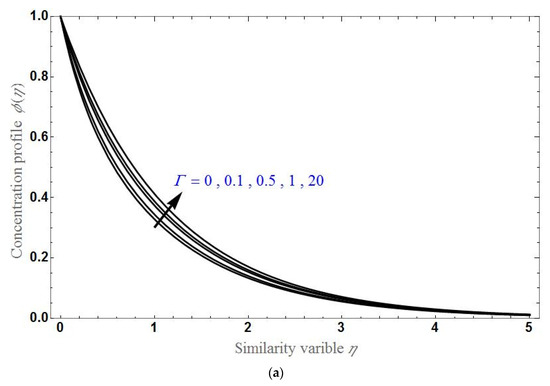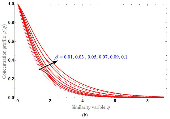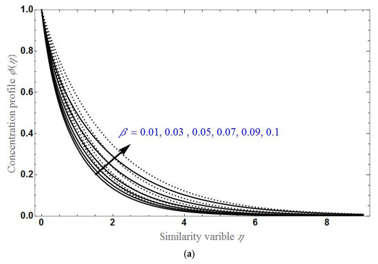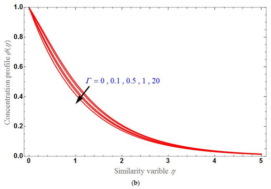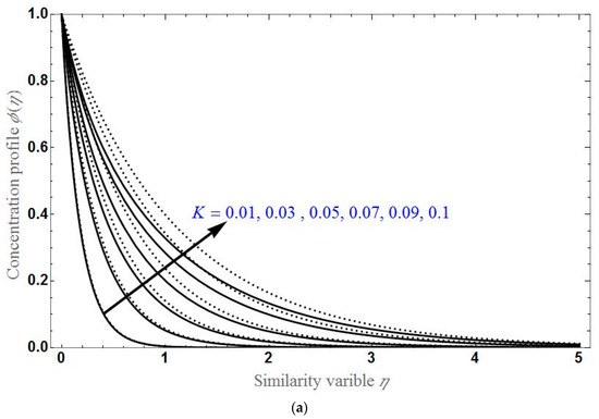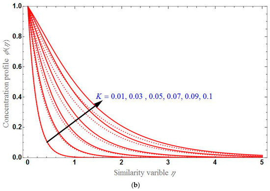 Figure 7, Figure 8 and Figure 9 demonstrated the concentration profile by varying different parameters. The behavior of according to the variation of , and for the stretching and shrinking cases is examined, respectively in Figures a and b. will be higher for greater values of K or . As seen earlier, will be greater for higher values of in the stretching case, and it will be less for higher values of in the shrinking case. decreases exponentially up to certain stage of and after that becomes constant at zero.