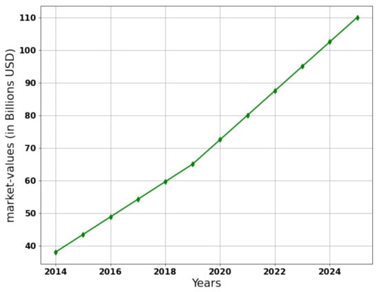 The growing food industry is increasingly confronted with new challenges related to food protection, food safety, and food quality with respect to industry, politics, and science. The food and beverage market is growing at a 36.34% compounded annual growth rate, and it will reach USD 142 billion by 2020 in India [1]. Moreover, the foodservice market has grown significantly since 2014. Figure 1 shows the growth of the foodservice market in India, which is expected to reach USD 110 billion in 2025 [2]. The rapid opening of food franchises and releasing of food and beverage products make it essential to serve healthy and fresh food. This is precisely in line with the World Health Organization (WHO) report, where is shown that, every year, more than 23 million European people suffer and around 5000 people die due to consuming contaminated food and water, which lead to foodborne diseases such as norovirus, listeria, salmonella, and many more [3,4]. Therefore, there is a need for a traceability mechanism that can track the backward and forward movement of food products and their ingredients in the supply chain and turn the food industry into a highly sustainable system [5,6,7,8]. Unfortunately, food traceability is a challenging task due to various reasons such as dynamic consumer preferences, traceability varying by industry, and the lack of standardization.