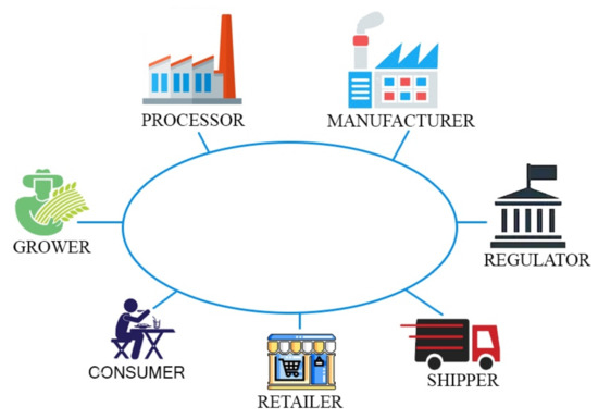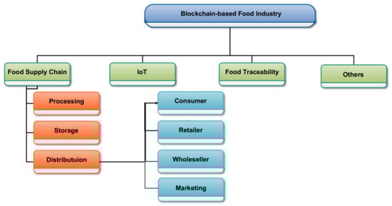 Further, the modern food industry uses advanced technologies such as agriculture machinery and robotics, reducing human labor and effort and boosting food processing, packaging, food serving, and production. All entities (for instance, retailer and consumer) are linked together in the food supply chain system, as shown in Figure 2 [28]. The existing system in the food industry needs to be more transparent and responsive with regard to food disaster traceability and food system security [29].