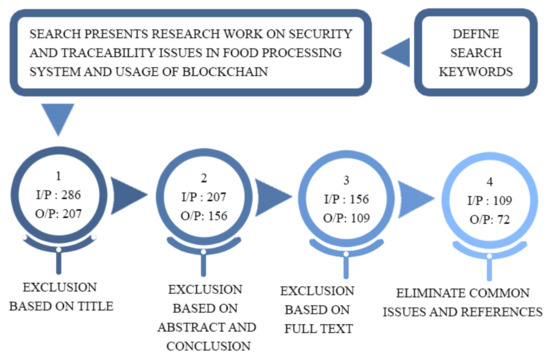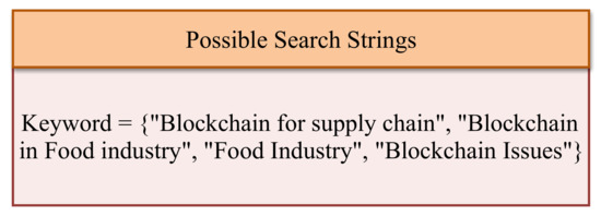 In this survey, we utilized keywords such as “Blockchain” or “Food Industry” and other associated keywords mentioned for the search criteria, as shown in Figure 3, on online digital repositories. Next, we manually started searching based on the distinct sections of the paper, for instance the relevant title, abstract, and conclusion, due to the massive literature collection. Finally, the manual search process selects the paper where the title or abstract of the paper contains the keyword or search string.