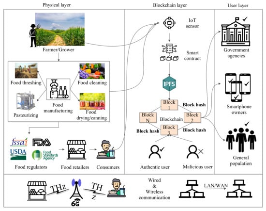 The prevailing technologies such as cloud computing systems and the Internet of Things (IoT) provide the monitoring and effective storage of particular data at different levels of the supply chain, for instance, food production, processing, dissemination, and consumption. Nevertheless, they operate on a centralized system, where all stakeholders have to depend on a single data source to store food data, resulting in severe issues such as a single point of failure, security and privacy issues, inflexible decision-making, etc. [9,10]. Consequently, most consumers face difficulty in gaining full transaction information related to the Food Product Life Cycle (FPLC), tracking the origins of products, and contamination [11]. In addition, the existing food systems are not effective at building customer’s trust due to third party involvement, degraded Quality of Service (QoS), traceability issues, and security issues (such as session hijacking, timing attacks, data breaches, and many more) in the food supply chain [7,9,12]. Moreover, food data security, privacy, and immutability are paramount issues in the food industry, which hinder the economic growth of governments, producers, farmers, consumers, and cold storage managers [13,14]. Therefore, there is a requirement for a promising technology, i.e., Blockchain Technology (BT), that can handle the aforementioned issues and offer effective and reliable food supply chain management [12].