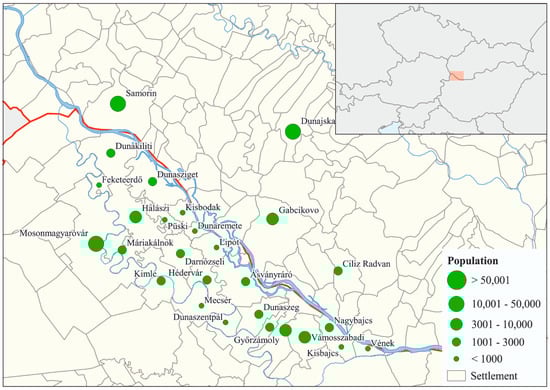 This cross-border area is two adjacent landscapes, also known as the ‘twin islands’ of the Danube, having been separated by a national border for over a century. The 1920 Trianon Peace Treaty designated the channel line in the main Danube Basin, which evolved in conformity with the Upper Danube management plan in Hungary between 1886 and 1896, as the state border between Hungary and Czechoslovakia [33], thus creating a fully artificial border section. Hence, the two regions form a coherent unit of the Little Plain from a natural geographic, floristic and socio-geographic aspect. This cross-border region has a total population of 235,000 inhabitants, 68,000 on the Slovakian side and 167,000 on the Hungarian side [34,35]. Figure 2 shows the structural composition of the municipalities in the Szigetköz–Csallóköz cross-border area.