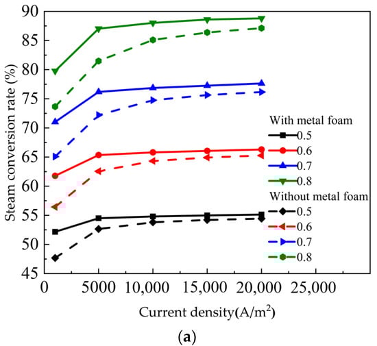 Figure 7a shows the influence of the SOEC with metal foam and without metal foam on the steam conversion rate under different gas utilization. The gas utilization had a great effect on the water conversion rate. The conversion rate of steam varied greatly with different gas utilization. Du et al. [42] studied the co-electrolysis of water and carbon dioxide in solid oxide electrolysis cells. As the gas utilization rate decreased, the voltage decreasesd and the electrolysis efficiency increased. As shown in Figure 7a, the gas utilization is increased from 0.5 to 0.8, and the steam conversion rate increased by more than 30%. This sharp change was expected because the steam conversion rate was strongly dependent on the inlet fuel flow. Nevertheless, the figure indicated that the SOEC with metal foam steam conversion rate was better than SOEC without metal foam. Figure 7b,c show the cathode activation overpotential and steam diffusion flux curve, respectively. The steam conversion rate increased from 86.39% to 88.6% when the gas utilization was 0.8 and the current density was 15,000 A/m2. The steam diffusion flux increases from 8.58 × 10−4 kg/(m2∙s) to 9.26 × 10−4 kg/(m2∙s). The cathode activation overpotential decreases from 0.13276 V to 0.13038 V. This was mainly due to the increase in the concentration of reactants at the TPB reaction interface as the gas utilization rate decreased, thus reducing the activation overpotential voltage.