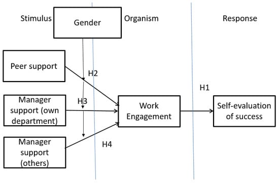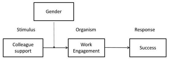 There are updated studies on work engagement in general []. Additionally, there is a recent study on salesperson turnover but not in work engagement []. This study focuses on colleagues’ support contribution to the work engagement of salespeople by addressing the literature gap. The stimulus-organism-response (SOR) theory was used as a theoretical basis (Figure 1). The SOR theory has been used in many fields []. Stimulus is an external shock which is represented by colleagues’ support in this study. Colleagues’ support includes peer support, manager (superior) support, and support from managers from other departments. The organism is work engagement, while the response is self-evaluation of success.