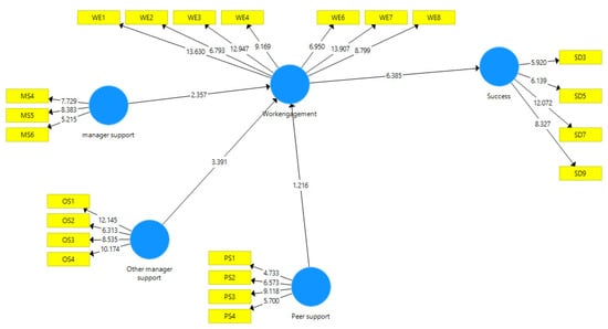 All the reliability and validity measures are satisfied after data cleaning. First, all variables of outer loadings of all indicators were greater than 0.70. One indicator of work engagement and one of peer support was slightly below 0.70. They were retained for completeness of the scales. Second, the Cronbach’s alphas of all constructs were greater than 0.70 (except for manager support at 0.663) with an average variance extracted (AVE) greater than 0.50. Hence, convergent validity is acceptable []. Finally, the discriminant validity was assessed using the Fornell–Larcker criterion (Table 2 and Table 3).