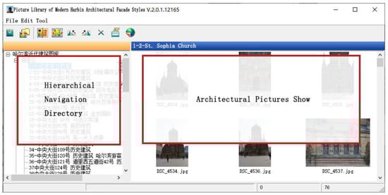 Firstly, the early image classification and identification was carried out on the basis of the extraction of the architectural facade style feature images, which were mainly completed by manual shooting and internet collection. After the completion of the image collection, according to the architectural facade style and the architectural use attributes, a platform for the picture library of the modern Harbin architectural facade styles was constructed to carry out the digital classification of the data collection for the development of the research, in order to improve the work efficiency of the data analysis (Figure 1). About 5000 images of the modern Harbin architectural facades and details were taken. The architectural facades were inevitably shielded by plants, wires, and other architecture. In addition, for the architecture with high height, we failed to find the appropriate shooting point. In the process of the image processing of this architecture, the more complete images of the architectural facades were picked out first, and then, some images were manually processed with Photoshop software so that they would look completely available (Figure 2).