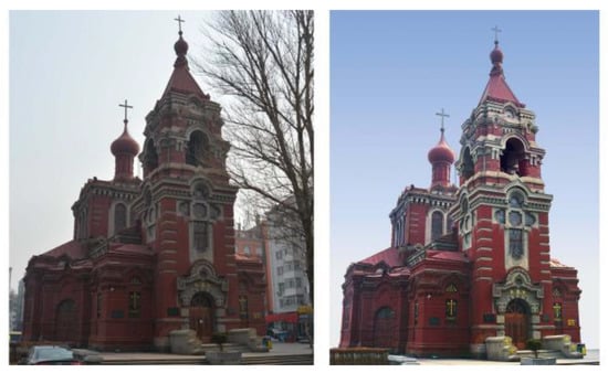 Harbin modern architecture basically refers to the buildings built in Harbin, China, during the historical period of modern social development (1840–1949) [1]. Modern Harbin is in the political situation of forced opening, and the architecture in this period has the typical characteristics of foreign cultural input. It is a special process in which the “integration and transformation” and “inclusion and innovation” of multi-source cultures are intertwined. From the perspective of the evolution of architectural style, “the integration of Chinese and foreign styles” and “the modern transformation of traditional architecture” are the essence of the evolution of the modern architectural style in Harbin. The modern architecture of Harbin is in the transition period of intersection between Chinese and Western and the replacement of old and new architectures; that is, the cultural collision of interwoven Chinese and Western architectures has also experienced the historical connection of modern architecture. The spatiotemporal relationship associated with it is intricate, and most of the modern architecture is still retained today; it has become an important composition of urban architecture today and an important embodiment of the planning and utilization of famous historical cities [2]. In recent years, the protection of the historical architectures in Harbin has been increasing year by year, and more attention has been paid to the sustainable use of the historical architectures and their application value in the restoration and renovation of old architectural facades. In 2020, the National Development and Reform Commission of China and the Ministry of Housing and Urban-Rural Development jointly issued the Notice on Further Strengthening the Management of Urban and Architectural Styles, emphasizing the strengthening of urban and architectural style management and the continuation of the urban context and reflecting the urban spirit. We shall clearly respect historical and cultural relics rather than the dismantlement of historical architectures and traditional dwellings [3]. Harbin modern architecture will play an increasing role in the planning of this famous city. The relevant research on how to make sustainable use of the modern architectural heritage and the restoration and renovation of the old buildings in Harbin has also increased rapidly.