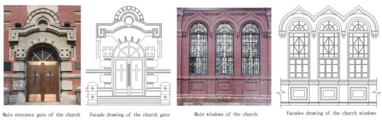 In these images, the decorative patterns that could distinguish the different historical styles, rather than the standard pattern of a certain architectural style, were mainly extracted. For example, in the facade of the St. Alekseyev church at No. 47, Shike Street, Harbin, the flame pattern was extracted from the decorative pattern of the facade, and the decoration of the main entrance of the church showed a huge and distinct flame symbol. The flame symbol of the main wall of the church was combined with the window and the window frame, which controlled the whole facade. A total of 21 valuable morphological elements were extracted from the collation of the decorative symbols of the church facade to correspond with the image recognition of the Russian style architecture (Figure 3). In the external facade processing of the Harbin Tang Gong Pavilion, the facade restoration was carried out according to the style elements of the new art movement architecture and the historical architectural photos (Table 2). A large number of CAD drawings were drawn for this purpose and were most likely to present the architectural facade and architectural details of the new art movement architecture because there was little modern architecture of this style in China. Moreover, some typical representative architectures were accurately processed in the same way.