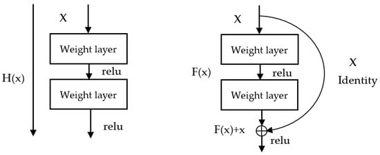 The comparison between the conventional convolution block and the residual block of ResNet is shown in Figure 4. For the conventional convolution block (on the left of Figure 4), we can use a nonlinear function H to describe the input and output of a block; that is, the input is X, and the output is H(x). H usually includes convolution, activation, or other operations. For the residual block of ResNet (on the right of Figure 4), through the shortcut connection, the output of the block is expressed as the linear superposition of a nonlinear transformation of input and input, where F(x) + x, F(x) is the residual. When F(x) = 0, this is an identity mapping transformation. Usually, F(x) is not equal to 0. To compare the left subgraph of Figure 4, F(x) = H(x) − x. Obviously, F(x) is more sensitive to the change of network output than H(x). The use of shortcuts is equivalent to amplifying the features of the changes, which is conducive to the learning of model weights; thereby, the network can be deeper. The proposed shortcut enables the convolution network model to reach thousands of layers, which effectively improves the performance of the model.