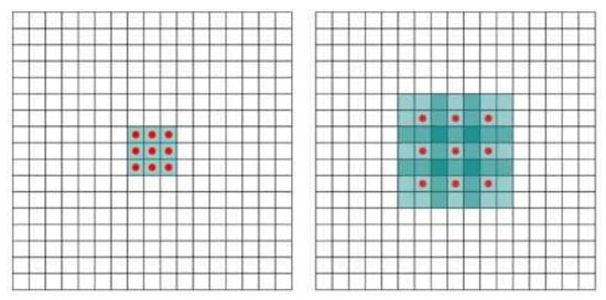 Dilated convolution is widely used in the field of image segmentation and can expand the receptive field without changing the amount of calculation [38]. As shown in Figure 6, the left figure is the ordinary convolution, and the right figure is the dilated convolution with a dilated rate of 2. As they are both 3 × 3 convolutions, the amount of calculation is the same. However, it can be seen from the right figure that the receptive field of dilated convolution with the dilated rate of 2 is equivalent to the ordinary convolution of 7 × 7, which is more conducive to obtaining the overall features of the image. Although the 3 × 3 convolution kernel can extract effective feature information while maintaining a small amount of computation, the ability of the single-scale convolution kernel to extract features is limited. When the size of the image is relatively large, with the deepening of the number of network layers, a larger receptive field is needed to obtain the effective features of the image.
