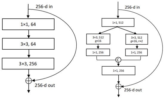 In order to obtain the multi-scale features of the target image, the CA-MSResNet model uses a residual block with group convolution and dilated convolution to enhance the extraction of context information features. Each residual block is shown in Figure 7, where the left is the ordinary residual block, and the right is the residual block of the CA-MSResNet model. Firstly, 1 × 1 convolution is performed to obtain the new channel dimension, and then, two operations are performed on these channels; the first is to use the group convolution to increase the diagonal correlation between the convolution kernels; the second is to use the dilated convolution to provide different scale features for the network to obtain a larger receptive field. Then, a 1 × 1 convolution is used for dimension reduction, and the outputs of the two are connected to obtain the enhanced context information feature; finally, the dimension is reduced by a 1 × 1 convolution layer. The residual block of the CA-MSResNet model uses group convolution to reduce the risk of over fitting, which greatly reduces the number of parameters, and uses dilated convolution to expand the receptive field and obtain multi-scale fusion features and richer context information. In Figure 7, the digits 16, 64, and 256 represent the number of channels, g represents the number of group convolutions, and r represents the dilated rate of dilated convolution.