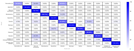 Therefore, we used the architectural details dataset, MCAP-Details-2555, to retrain the CA-MSResNet-M1 model, and we obtained the CA-MSResNet-M2 model. The classification accuracy of the CA-MSResNet-M2 model is 85.9%, and the F1 index is 0.862. At the same time, in order to observe the difference in the classification accuracy of each architectural facade style in detail, we provide the error confusion matrix of the CA-MSResNet-M2 model on the test dataset, as shown in Figure 10.