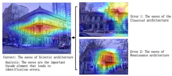 It can be seen from Figure 8 that the accuracy of each style in the test dataset is different. The highest accuracies are 100% for the Japanese style, 100% for the Baroque, 100% for the Byzantine, 100% for the Chinese and Western integration, and 93.75% for the new art movement. The low accuracies are mainly 40% for decorative art, 61.9% for the eclectic, 80% for the classical, and 80% for the Russian style. The heat map is an effective visualization method for the interpretability of the neural network model. In this paper, the class activation mapping method proposed in [43] is used to generate the heat map. Through the heat map analysis, it was found that the images that were incorrectly classified had similar characteristics in the architectural facades to the images that were correctly classified. For example, in Figure 9, the left image that is correctly classified is eclectic architecture, and its hotspot is concentrated in the eaves, but the right images are incorrectly classified are classical architecture and Renaissance architecture, both of which have similar eaves, which leads to the CA-MSResNet-M1 model identifying them as eclectic architecture. It is difficult to improve the prediction accuracy of the model only trained by the architectural facade images.