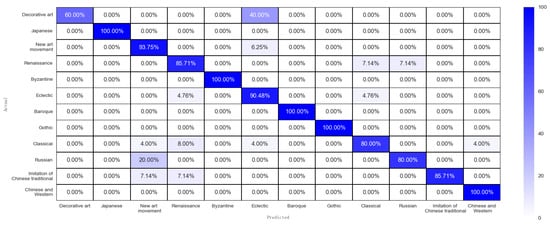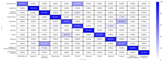 According to our existing datasets and the characteristics of each style, 12 Harbin modern architectural styles were carefully selected. Focusing on these 12 styles, there is also a major reason that these style features are sufficient to distinguish between the different architectures, but at the same time, they also have similarities. This provides a good example for the prediction models to more accurately identify various styles. As mentioned earlier, in modern Harbin, foreign style architecture generally had an eclectic style, but they also had some collective components themselves and obviously had a certain style as the main tone, such as Gothic, classical, Renaissance, Baroque, etc. The similarities they show are difficult for computer identification, but some differences will be found in each of the architecture details and decorative patterns. For example, there are similarities in the roofs, eaves, doors, and windows between classical architecture, eclectic architecture, and Renaissance architecture, but there are more obvious differences in the balconies and decorative patterns; there are also similarities in the decorative patterns, eaves, doors, and windows between imitation Chinese traditional architecture and Chinese–Western integration architecture, but there are obvious differences in the cornices and dormers (Table 1). We tested our model to see if it could identify these differences, and it is important to enhance the model to accurately identify these similarities and differences.