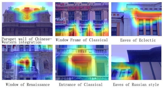 As can be seen from Figure 10, in terms of the accuracy, the decorative art has increased to 60%, the classical has increased to 88%, the imitation Chinese traditional has increased to 92.86%, and the eclectic has increased to 80.95%. However, there is also a decline in the classification accuracy of some styles, such as the Russian style from 80% to 60% and the Byzantine from 100% to 75%. We tried to analyze the reasons for the rise through the heat map and found that the CA-MSResNet-M2 model was able to learn the details of the architecture, which helps it to improve the accuracy of its classification of architectural facade styles (Figure 11). The first line of Figure 11 shows that the model correctly learned the parapet wall of Chinese–Western integration architecture, the window frame of classical architecture, and the eaves of eclectic architecture, and the second line shows that the model correctly learned the window of the Renaissance architecture, the entrance of classical architecture, and the eaves of Russian style architecture, which are helpful in improving the accuracy and interpretability of the model in identifying the corresponding architectural facade styles. At the same time, we found that the model has higher accuracy for images with obvious decorative symbols in detail than images without decorative symbols. However, the above two models failed to predict the similarities of some decorative symbols. One of the reasons why neither model has found a suitable decorative style may be the existence of facade decoration symbol deformation and variables, which make it difficult for the models to recognize these features.