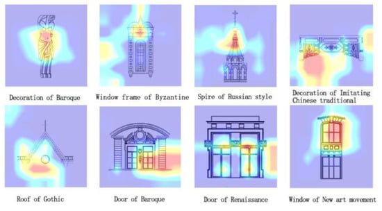 In the test, we also found that some errors were due to the inconsistency between the decorative patterns at a specific position of the architectural details and the correct style patterns, and there were deformation and quantitative changes in the pattern. So, we retrained the CA-MSResNet-M2 model using the MCAP-CAD-660 as the training dataset and obtained the CA-MSResNet-M3 model. The classification accuracy of the CA-MSResNet-M3 model is 87.5%, and the F1 index is 0.902. At the same time, in order to observe the difference of classification accuracy of each architectural facade style in detail, we provide the error confusion matrix of the CA-MSResNet-M3 model on the test dataset, as shown in Figure 12. The Byzantine comes back to 100%, the Russian style comes back to 80%, the eclectic rises to 90.48%, and the Gothic rises to 100%. Through the analysis of the heat map, we can see that the CA-MSResNet-M3 model can better learn the key features of the pattern symbols contained in the CAD drawings, such as the decorative part of the Baroque, the flame pattern window frame of the Byzantine, the spire of the Russian style, etc. (Figure 13).