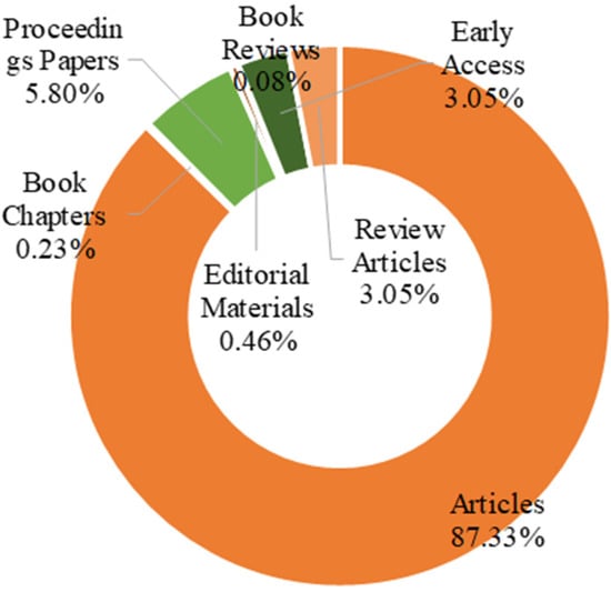 A total of 1231 initial bibliometric records from 1995 to 2022 were retrieved. As shown in Figure 2, seven types of literature constitute the sample data, including 1144 articles, 76 proceedings papers, 40 early access, 40 review articles, 6 editorial materials, 3 book chapters, and 1 editorial material. Table 1 displays the main information of the data set in terms of basic count, citation, and author. A total of 2888 authors have published articles on the theme of risk management in FDI. The total citation amount of articles in this field reached 32,114, with an average of 26.09 citations per article.
