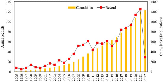 Figure 3 displays the evolution of scientific production in this field. The annual and cumulative publications demonstrate that the first paper concerning risk management in FDI appeared in 1995. Since 2000, the number of annual publications has exceeded 10, and then it experienced relatively slow growth between 2002 and 2006. After 2015, global attention has been paid to this research subject, and the number of publications has been rising quickly in a volatile manner, which shows a trend of exponential growth. In 2021, the annual publication number reached 125. The record for 2022 shows a decline due to incomplete data. The average growth rate in cumulative publications from 1996 to 2021 reached 21.4%, indicating an increasing research interest in this topic.