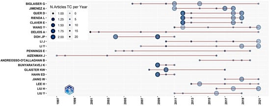 As many as 2888 authors have contributed to the research on this subject. Figure 4 displays the annual publications and citations of the 20 most productive authors. Biglaiser G is the most productive author in this field, publishing a series of papers between 2006 and 2021. Jimenez A, Quer D, and Rienda L are scholars who have been more active since 2011. In terms of period, Delios A and Aizenman J have continued to work in this research field for more than 20 years. It is pointed out that the majority of articles by top productive authors were published after 2010, indicating that this field has been receiving academic attention over the past decade.