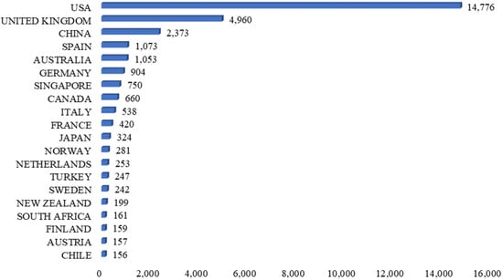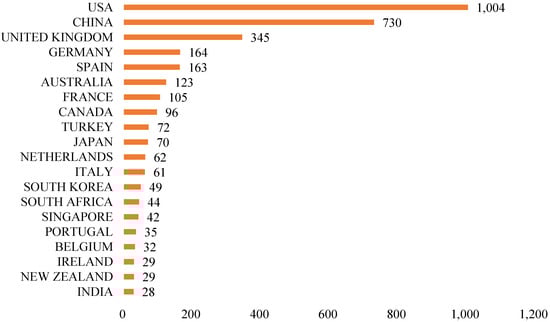 To find the leading countries in the research field, this paper lists the most productive and cited countries in Figure 5 and Figure 6. According to Figure 5, the two countries with the largest publication numbers are the United States (USA) and China, with 1004 and 730 records, respectively. British scholars have also made important contributions to the research on this subject, ranking third in the number of publications. The order of cited countries shown in Figure 6 is basically in line with productivity. American scholars received the highest number of citations, followed by Chinese and British scholars. It is worth noting that Singapore ranks 15th in production, but it is the 7th most cited country. Similarly, Norway is the 21st most productive country, but the 9th most productive country.