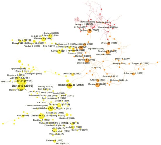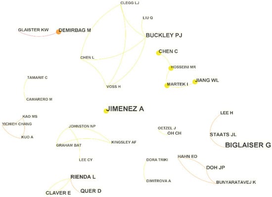 Collaboration is essential for the development of research in this field. From the perspective of social networks, the mapping and analysis of cooperative networks help to discover the characteristics of scientific collaboration and the status of institutions and individuals. Figure 7, Figure 8 and Figure 9, respectively, show the micro, meso, and macro scientific cooperation networks. Among them, the size of each node in the network shows the publication number of different authors, institutions, and countries (regions); the thickness of the links between nodes is proportional to their co-occurrence frequencies; and the color of the links represents the time when the cooperation occurs. Due to the limitations of CiteSpace software, the names of authors and countries (regions) are expressed in capital letters.