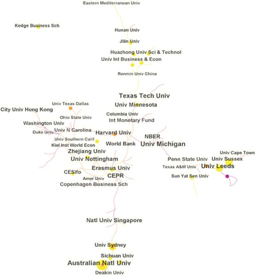 Figure 8 shows a relatively dispersed institution collaboration network. Although many institutions have participated in the research of risk management in FDI, no in-depth cooperative relation has been formed. In institution collaboration networks, CEPR, University of Michigan, World Bank, National Bureau of Economic Research, Erasmus Universiteit Rotterdam, and Harvard University are the central nodes and play key roles in connection. In addition, most of the inter-institutional cooperation takes place within countries. For example, the Australian National University, Deakin University, and the University of Sydney in Australia are closely connected in the network, while the University of Leeds and Sussex University in the UK are tightly linked; China’s Hunan University, Jilin University, Renmin University of China, and Huazhong University of Science and Technology are close in the network.