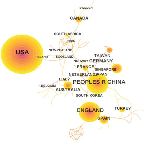 Figure 9 describes the country (region) collaboration. When both countries appear in the address field, they are considered to have a cooperative relationship. The US, China, England, Australia, and Germany are the top five countries (regions) with the largest number of publications. England is closely linked to European countries such as Spain, Portugal, Denmark, and Turkey. In addition to Asian countries such as Singapore, Japan, and South Korea, China is also linked with European countries such as the Netherlands. The United States has extensive cooperation in the Americas, Europe, Africa, and other countries.