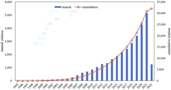 The development trends of the annual and cumulative citations were extracted from the Citation Report created by the WoS platform. As shown in Figure 10, the first citation on this subject appeared in 1995. Since 2006, the annual citation frequency has shown an exponential growth trend, and it began to exceed 1000 times in 2011. In 2021, the annual citation frequency has reached 5151 times, which demonstrates that the academic community shows constantly increasing attention to this subject.