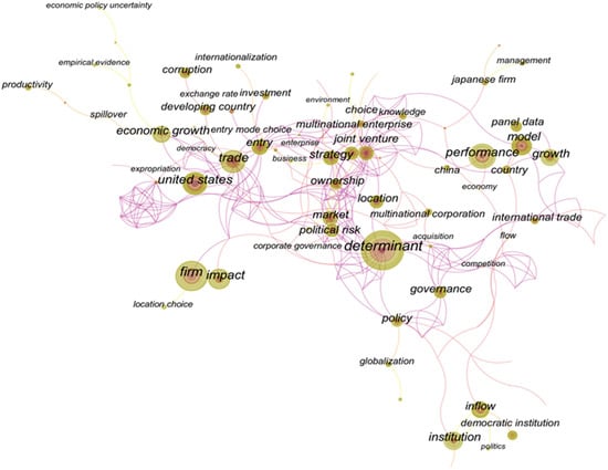 Co-word analysis can help to extract the research hotspots. As FDI, risk, and uncertainty are indexing words that add limited value to the analysis, they were eliminated from the results. Moreover, the acronyms (such as FDI and foreign direct investment) were harmonized.
