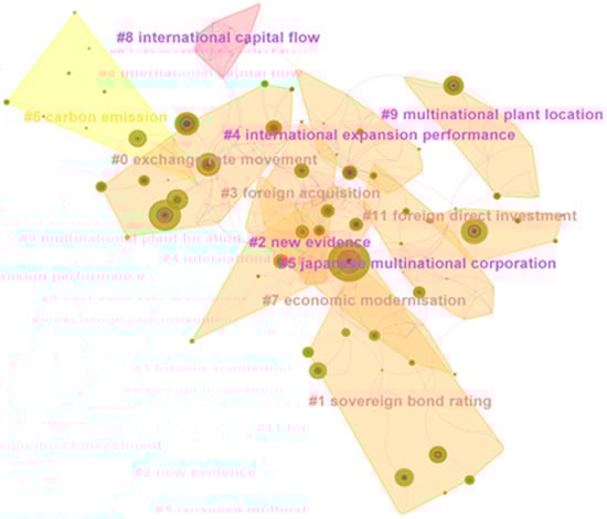 Clustering analysis of the literature was implemented using CiteSpace. After removing unrelated articles, the sample data were clustered into 11 interrelated categories. Since some clusters distant from the main network are eliminated, the sequence of the labels is not continuous. As shown in Figure 13, the articles in the same cluster are closely related and have high similarities. They may face similar problems, such as #8 international capital flow, #9 multinational plant location, #3 foreign acquisition, #4 international expansion performance, and #5 Japanese multinational corporation. Some of them concentrate on similar risks such as #0 exchange rate movement; #1 sovereign bond rating, and #7 economic modernization. Considering the time dimension, #6 carbon emission is a prominent research theme trending currently.