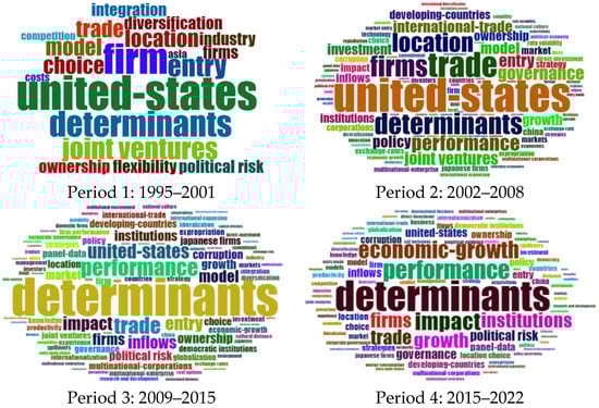 We also drew the word clouds of keyword plus at four different periods to show the distribution and evolution of research topics. As shown in Figure 14, the font size of the keywords reflects the frequency of occurrence. In Periods 1 and 2, prominent keywords in the figures are the United States, determinants, firm, trade, joint ventures, etc., which reveals that the FDI of American enterprises is the hot topic in the research before 2008. In Periods 3 and 4, determinants become the most obvious word. The United States became smaller, while China and developing countries began to emerge, which indicates that FDI research turned to more developing countries.