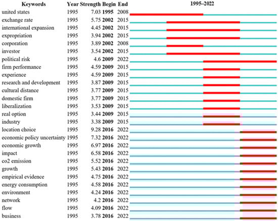 Burst analysis can reveal the important change in the research topic in the field of risk management in FDI. As shown in Figure 15, the United States earned the highest burst value (7.03) from 1995 to 2008. According to the duration time of keywords, the research evolution on risk management in FDI can be divided into three stages. Before 2008, research keywords concentrated on the United States, exchange rate, international expansion, expropriation, corporation, and investor. Based on the previous stage, the research topic in this field was expanded to political risk, cultural distance, domestic firm, liberalization, real option, and industry between 2009 and 2015. From 2016 to 2022, the research topics changed to economic policy uncertainty, CO2 emissions, energy consumption, environment, and networks. In addition, political risk has been an important keyword since 2009.