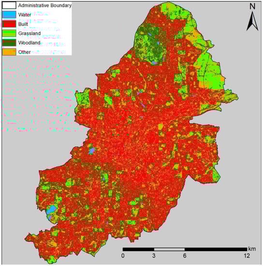 Current land cover within the Birmingham City Council administrative boundary. The “other” class typically comprises bare, or seasonally bare (e.g., cropland) soil.