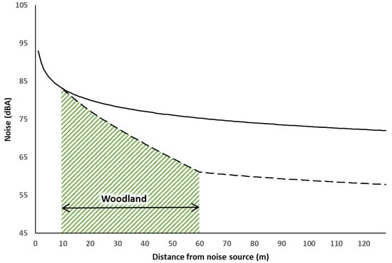 An example of how noise level changes over open ground (solid line—no mitigation), and through woodland stretching from 10 m–60 m (dashed line—mitigated by trees). Noise decline in open air is 3 dBA per doubling of distance for a linear noise source. Note that the rate of attenuation of noise is greater than noise in open air, by an additional linear rate of 2.84 dBA m−1 only whilst travelling through woodland.