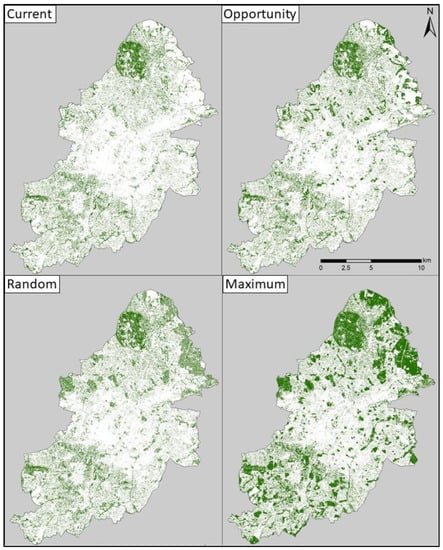 The maps of woodland allocation under each scenario are shown in Figure 4. The maximum scenario, where all grassland is converted to woodland, highlights the extent of the potential woodland candidate sites. The woodland in the random scenario broadly covers the same areas, but in a much sparser fashion. The more focused distribution of woodland in the opportunity scenario map is apparent when compared with the random scenario map, particularly in the north-eastern region of the city, along the administrative boundary. These aggregations of new woodland are around roads and residential buildings.