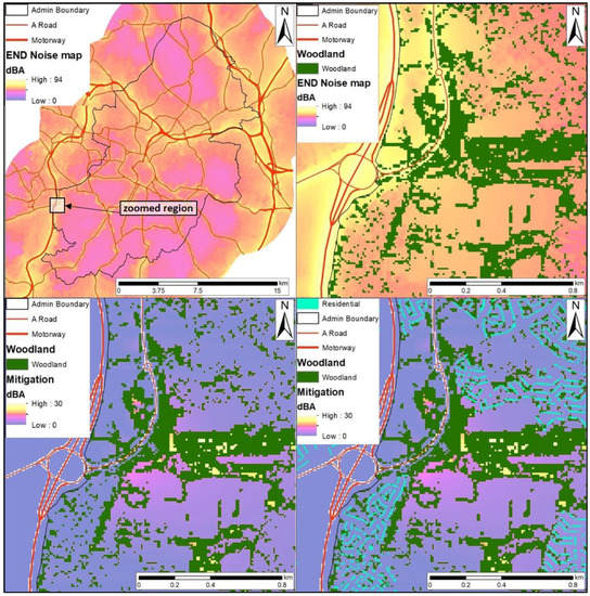 Four panels, clockwise from top left are: full extent of Birmingham administrative region plus five km buffer, with END noise map, showing the zoomed region in the following three panels; END noise map data and woodland; noise mitigation and woodland; noise mitigation, woodland and residential buildings.