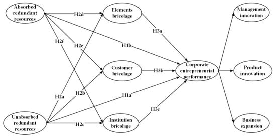 Resource bricolage can examine existing resources from different perspectives, and can fully explore the inherent attributes of resources, which helps enterprises to control and utilize opportunities, and also stimulates entrepreneurial activities and improve performance [55]. Insufficient utilization of redundant resources will result in idle resources. At this time, managers will explore new paths in order to revitalize and utilize resources and reduce cost pressures. Entrepreneurial activities can realize the efficient use of resources [56]. In addition, enterprises can integrate internal redundant resources and external resources, realize the transformation and use of resources, and then convert them into entrepreneurial activities to improve entrepreneurial performance [57]. Therefore, we propose the following hypotheses: