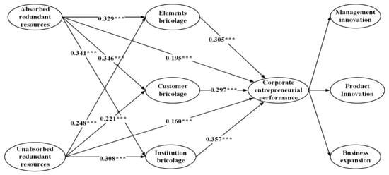 The specific hypothesis test results are shown in Figure 3. Unabsorbed redundant resources and absorbed redundant resources had significant positive effects on corporate entrepreneurial performance. Thus, H1a and H1b were supported. Unabsorbed redundant resources had a significant positive impact on elements bricolage, customer bricolage and institution bricolage, respectively. Thus, H2a, H2b and H2c were all supported. Similarly, absorbed redundant resources produced a significant positive influence on elements bricolage, customer bricolage and institution bricolage, respectively. Thus, H2d, H2e and H2f were all supported. In addition, elements bricolage, customer bricolage and institution bricolage all produced significant positive effects on corporate entrepreneurial performance. Thus, H3a, H3b and H3c were all supported.