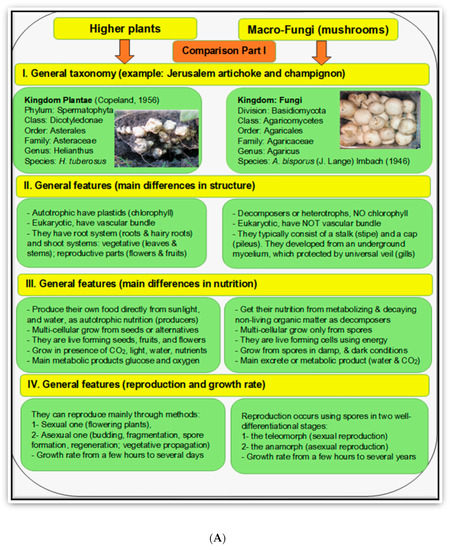 Higher plants have many similarities and differences to macro-fungi (mushrooms) as presented in Figure 6A,B. Both higher plants and mushrooms are living organisms belonging to one domain (Eukarya) and are considered, in general, vegetarian as well as both of them possessing distinguishing attributes for human health. High plants are located in the Kingdom of Plantae, but mushrooms are in the Kingdom of Fungi. They can also be used as edible sources for medicinal activities.