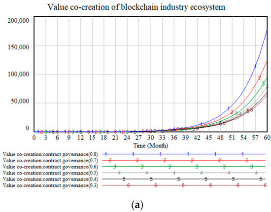 The numerical value of trust governance (relationship trust and calculation trust) is maintained at 0.4, and the numerical value of contract governance (contract coordination, contract control, and contract adaptation) is adjusted sequentially from 0.3 to 0.4, 0.5, 0.6, 0.7 and 0.8 to obtain six schemes. The corresponding simulation results are shown in Figure 6. Figure 6a,b respectively show the impact of contract governance on value co-creation and resource innovation of blockchain industry ecosystem.
