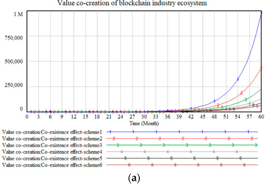 The numerical value of contract governance (contract coordination, contract control, and contract adaptation) is adjusted sequentially from 0.3 to 0.4, 0.5, 0.6, 0.7 and 0.8, and the trust governance is adjusted correspondingly from 0.4 to 0.5, 0.6, 0.7, 0.8 and 0.9, and six schemes are obtained. The simulation results are shown in the Figure 8. Figure 8a,b respectively show the co-existence effect of contract governance and trust governance on value co-creation and resource innovation of blockchain industry ecosystem.
